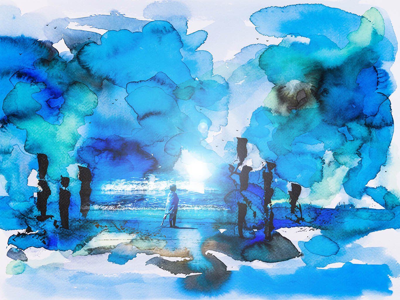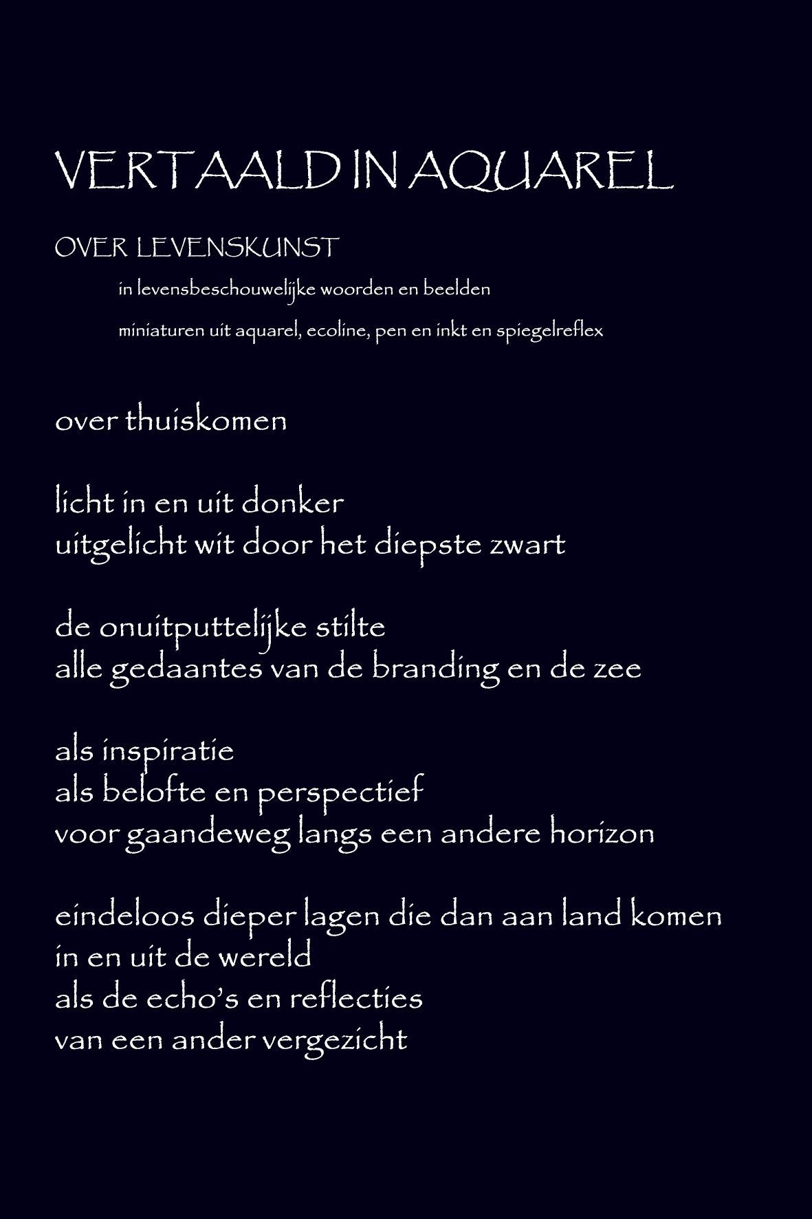 Hier is de tijd de rust en ruimte. Hier is alle tijd van de wereld en dit is méér dan ik nodig heb voor nu. Een rotsvast fragment eeuwigheid als opwaarts drijvende geestkracht. Zo kom ik dan op de achtergronden waartegen mijn werken gemaakt zijn. De aquarellen en foto’s als ansichtkaarten van oude vergezichten: gelaagde landschappen van emoties, oude pijn, verdriet en alle tranen die opgegaan zijn in een groter, hoopgevend geheel. Het zijn gelaagde miniaturen, reflecties, introspecties, rondvluchten, excursies, omzwervingen, inkijkjes, reisverhalen, om- en doordenkers. Beelden die uit een toekomst van het verleden bestaan. In mijn huis lopen de stilstaande klokken van heden, verleden en toekomst weer synchroon. Het is tijd voor een geheel hernieuwde open dag.