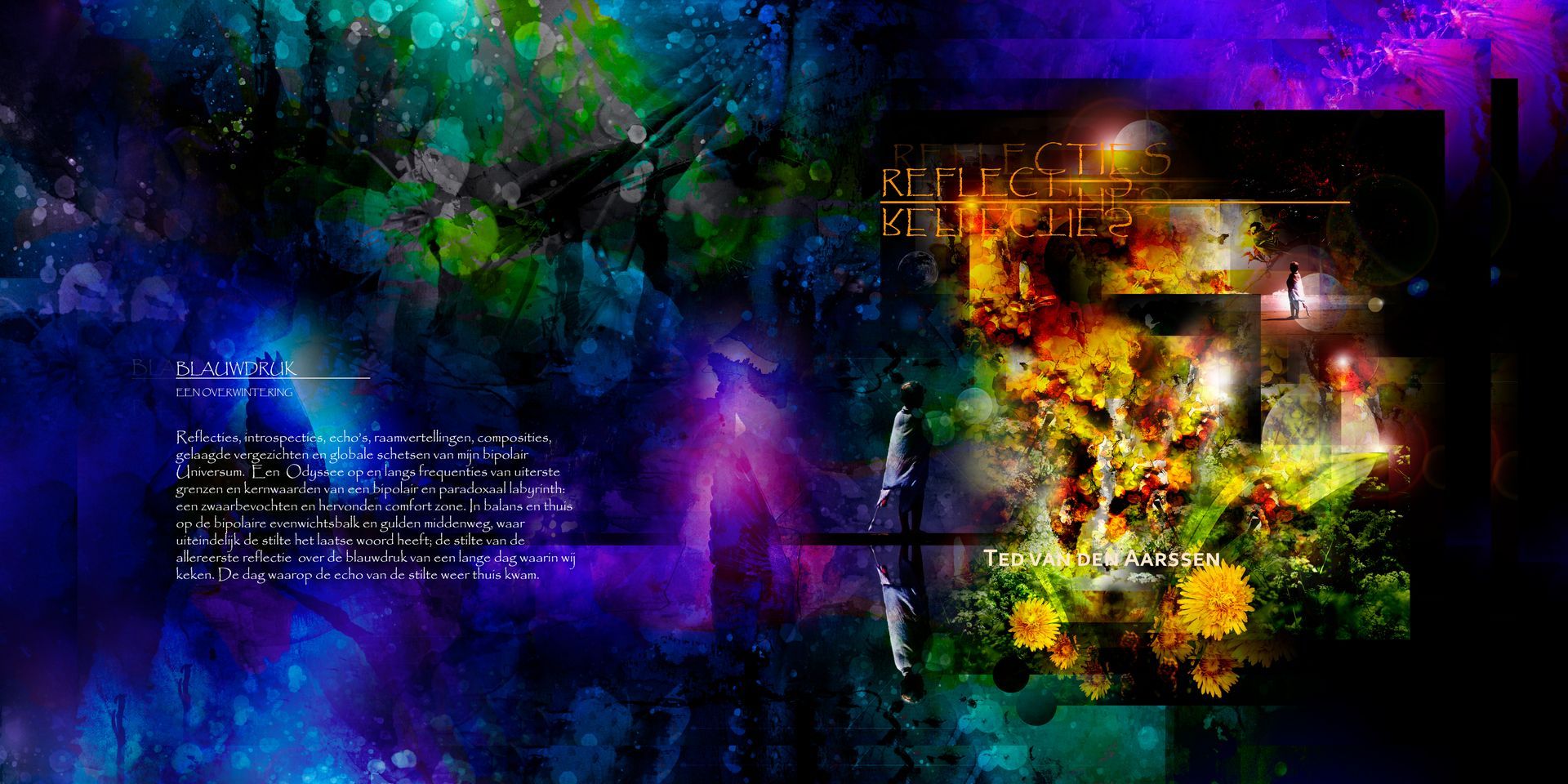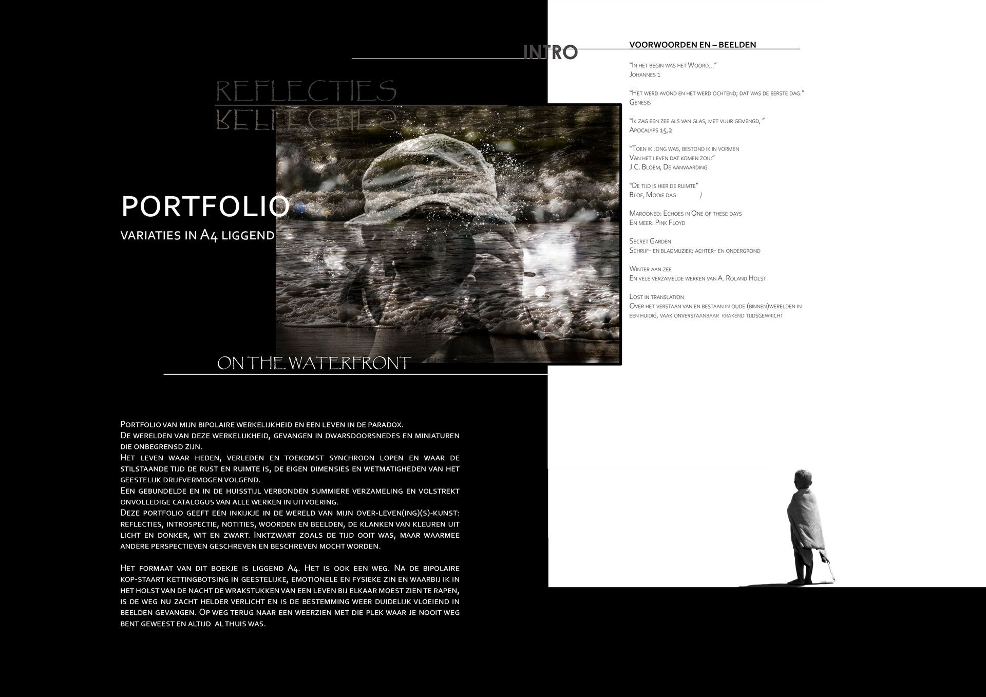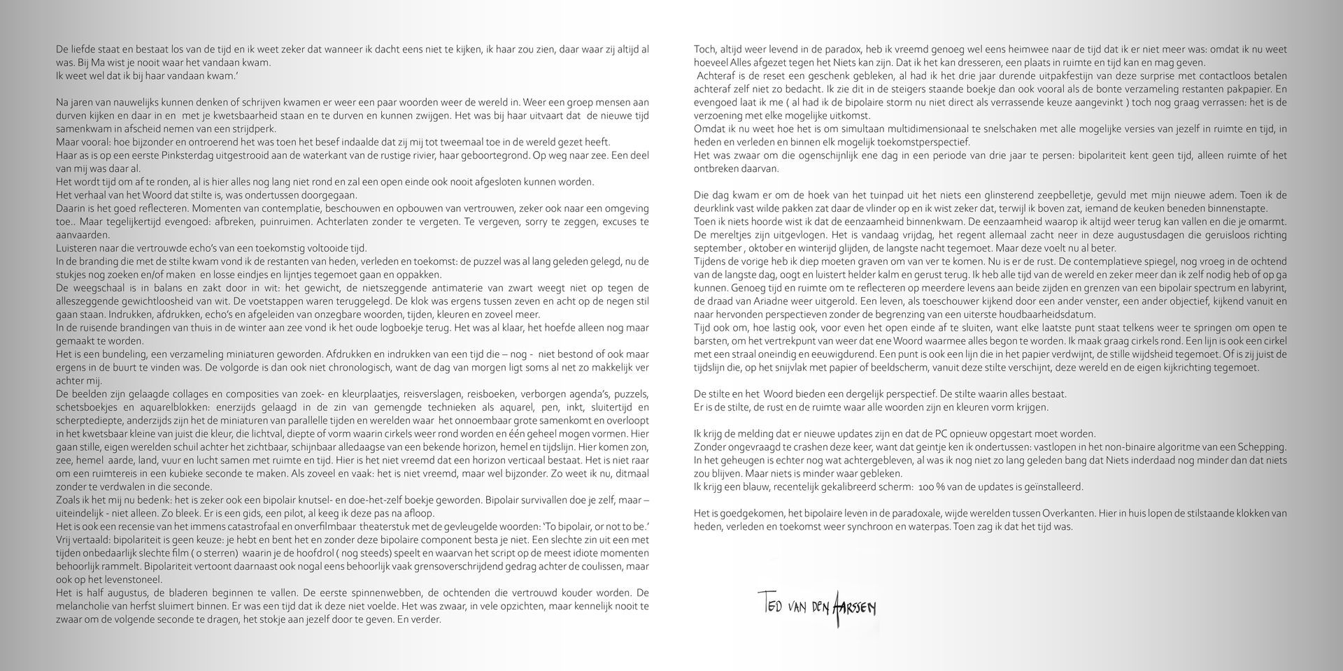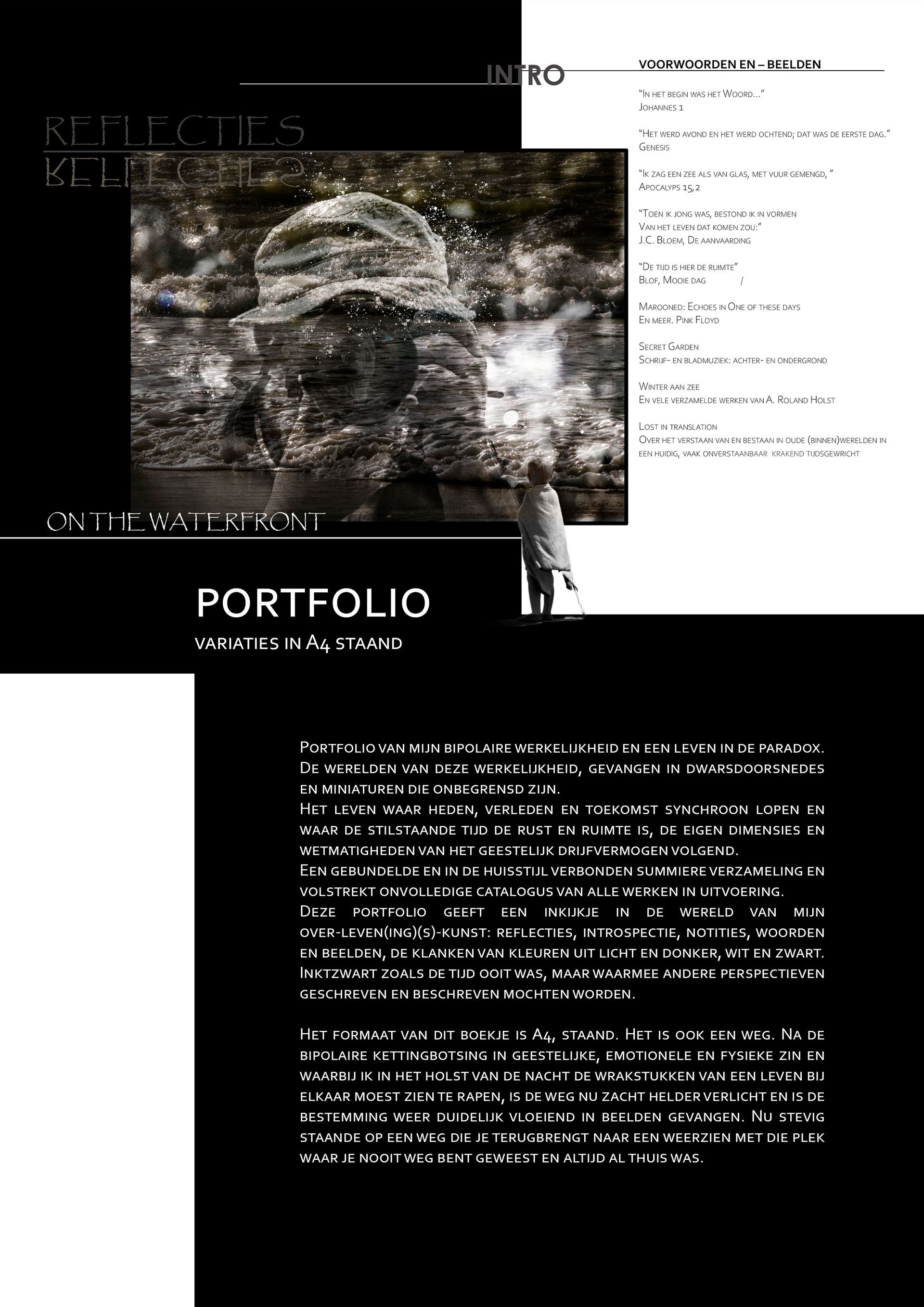 Bundeling fragmenten van een tocht dwars door mijn bipolaire werkelijkheden, op weg naar die nieuwe dag. Een verzameld werk van miniaturen, bedoeld om een indruk achter te laten van mijn werk en huisstijl.