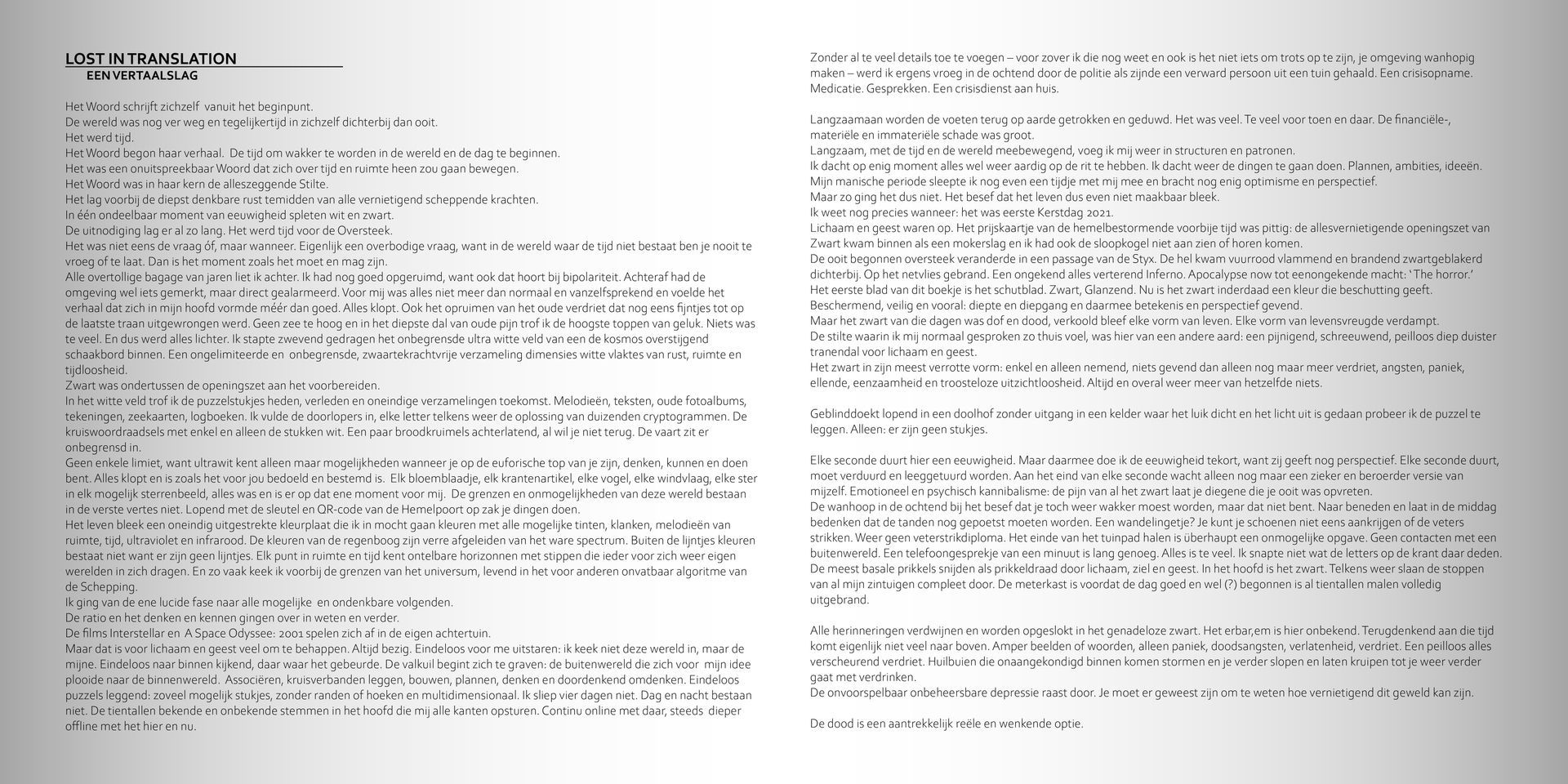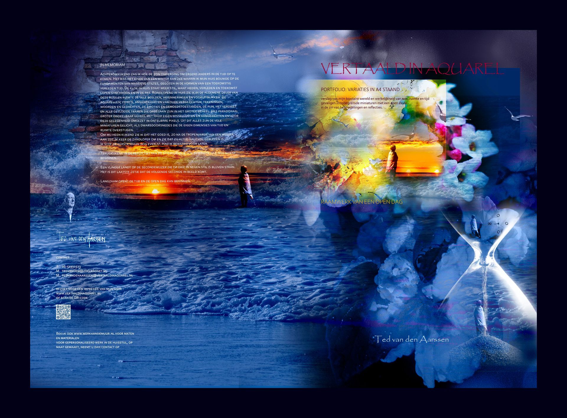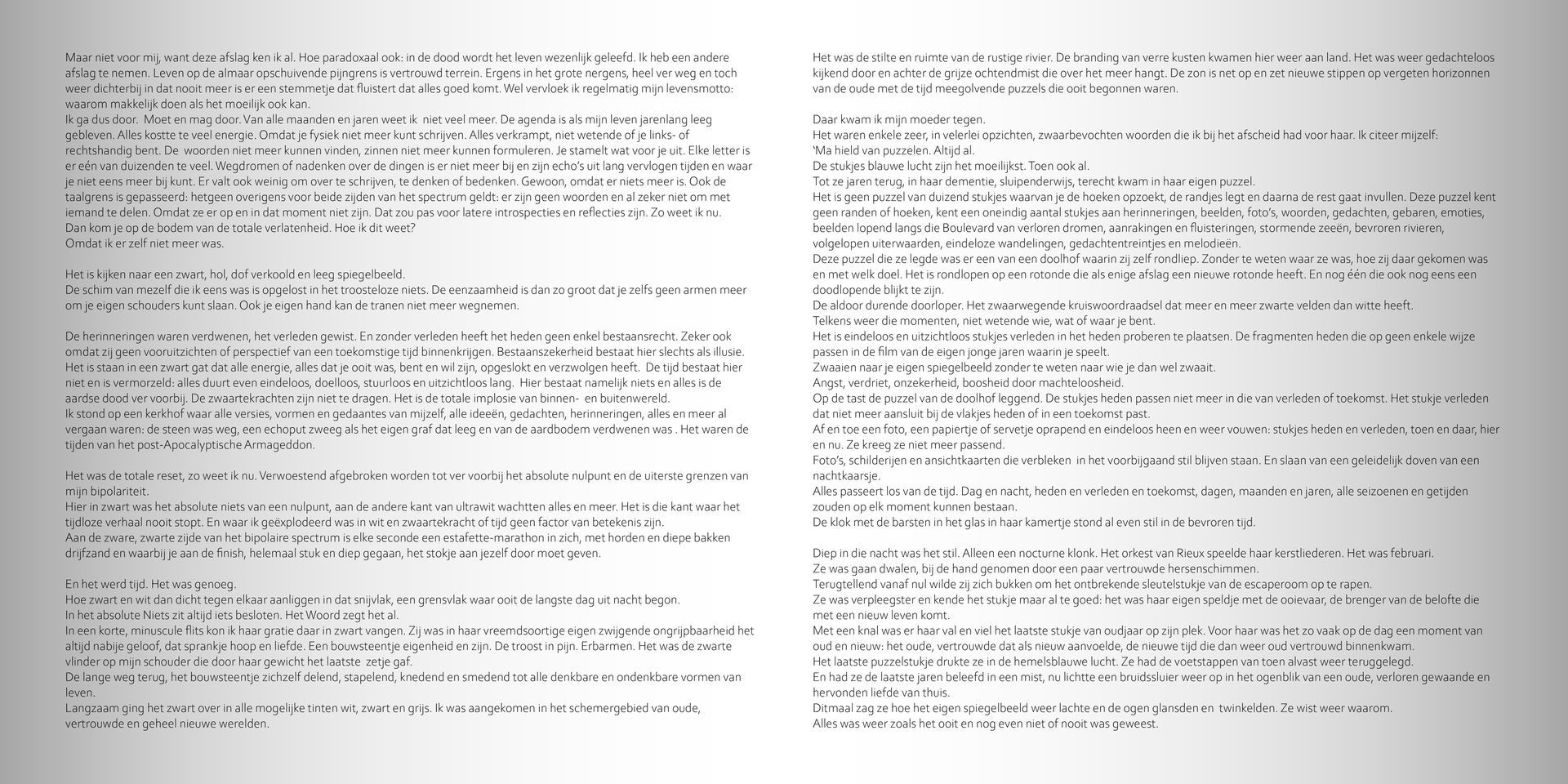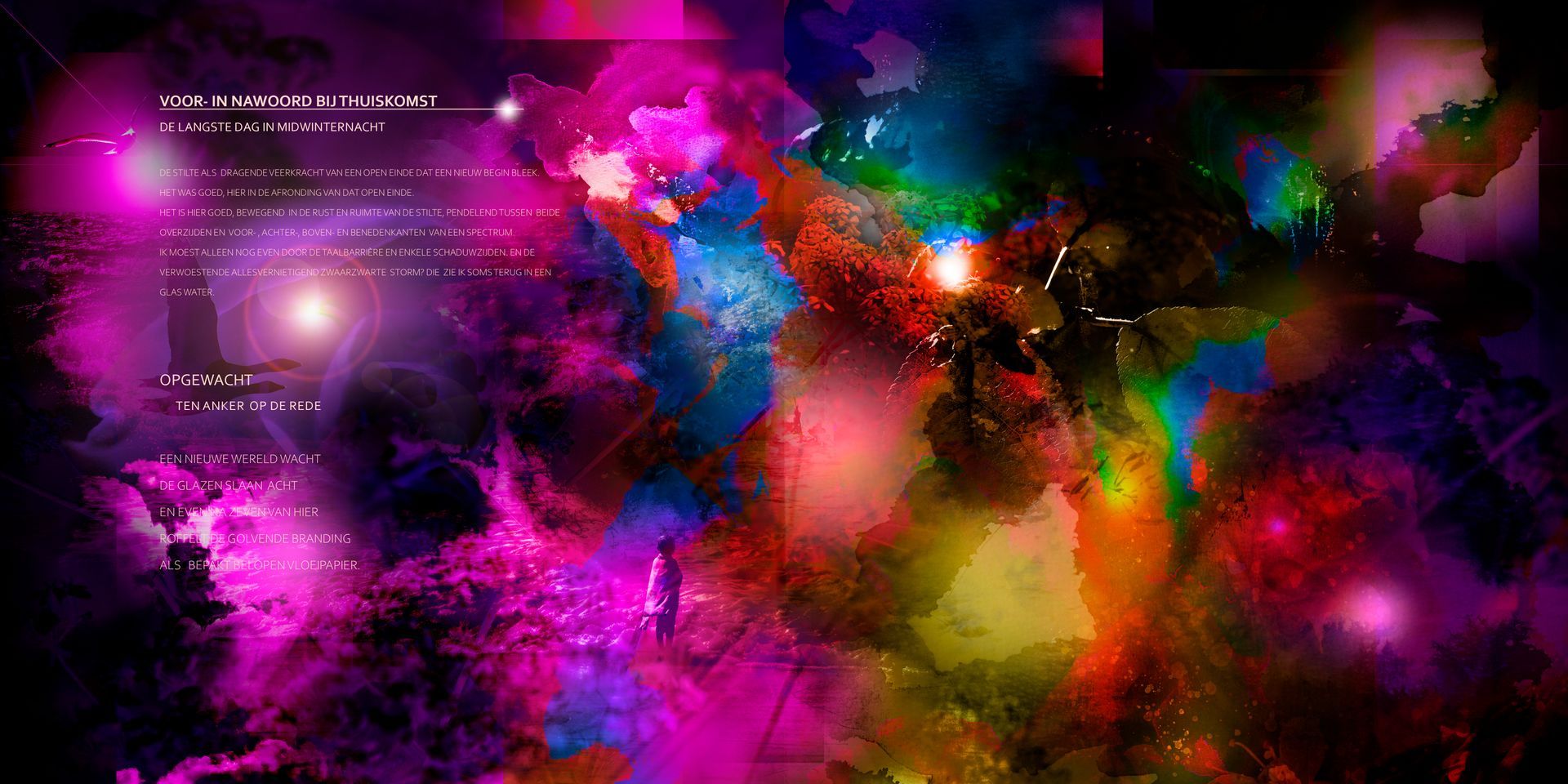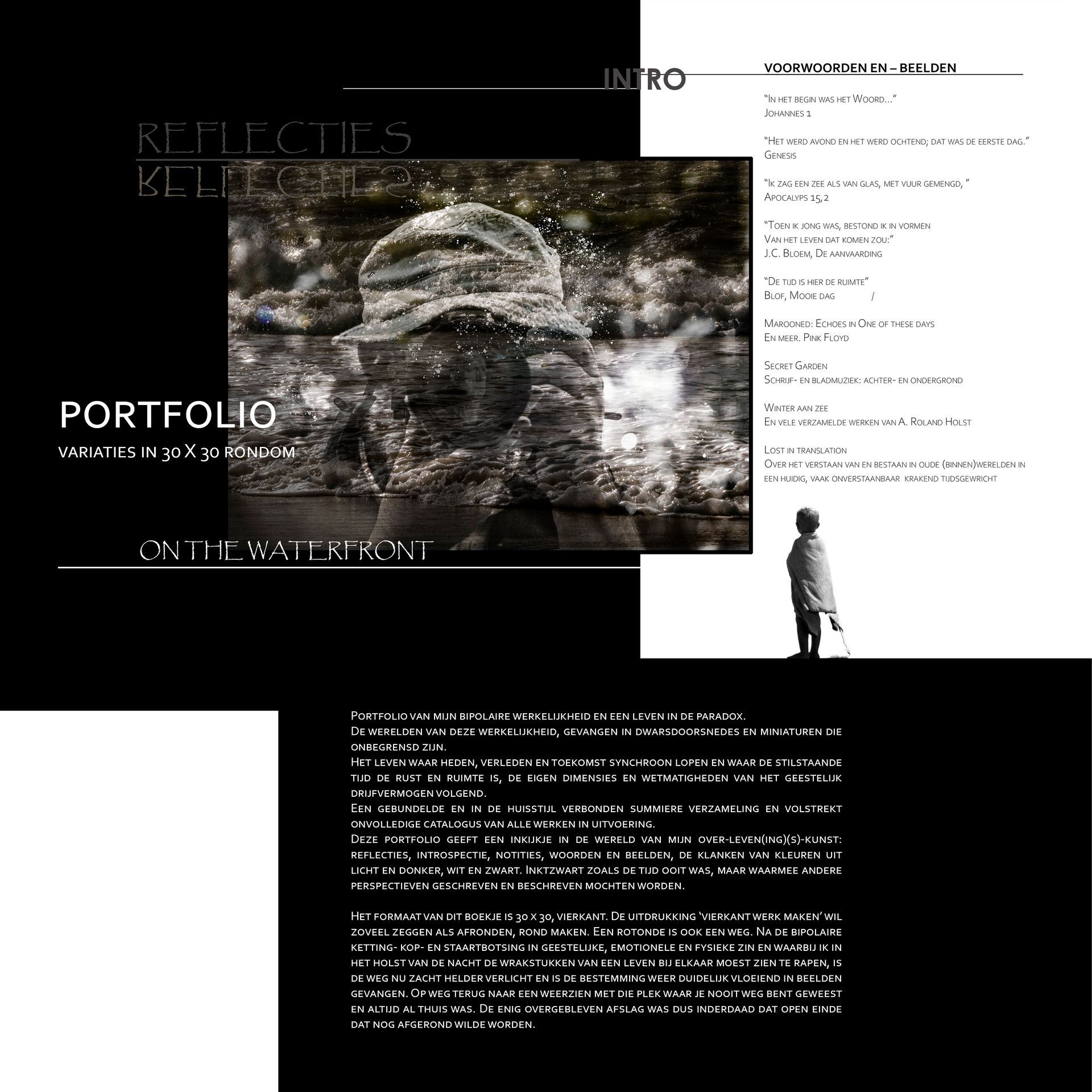 Bundeling fragmenten van een tocht dwars door mijn bipolaire werkelijkheden, op weg naar die nieuwe dag. Een verzameld werk van miniaturen, bedoeld om een indruk achter te laten van mijn werk en huisstijl.