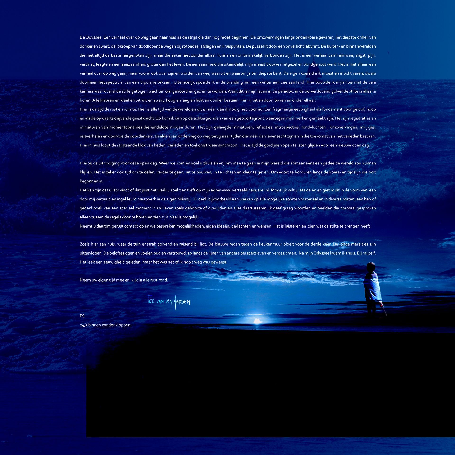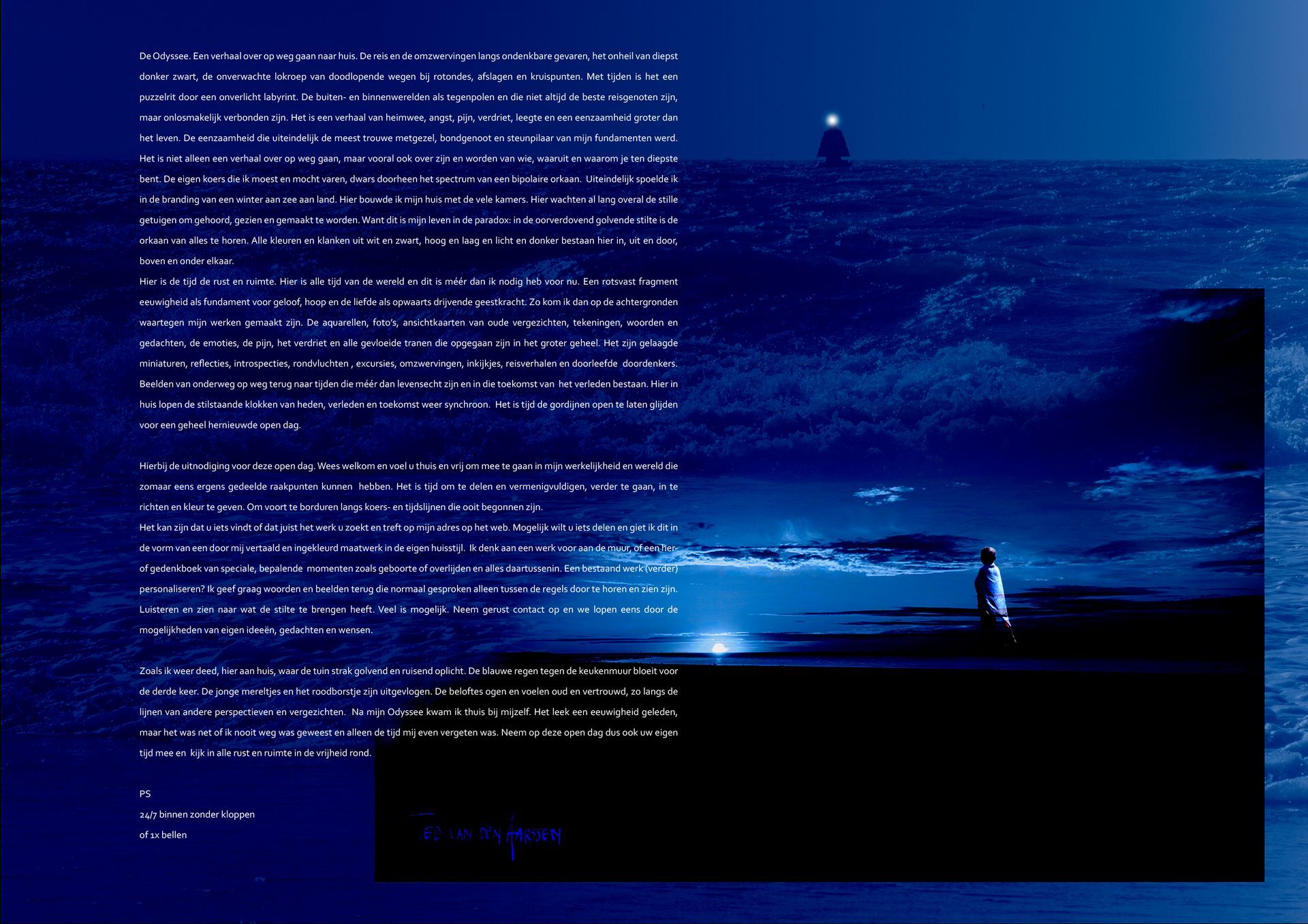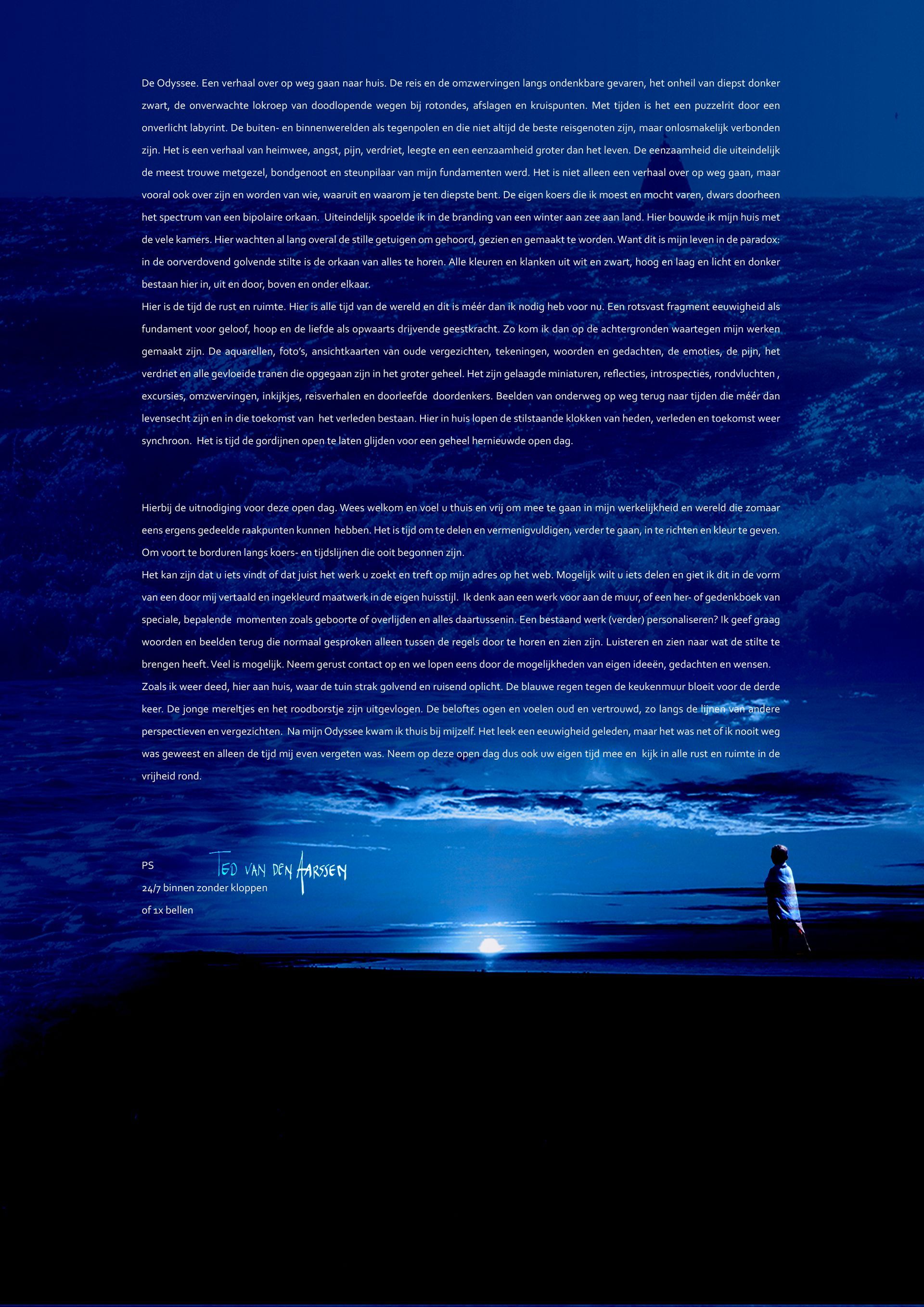 Het is het gecomprimeerde verhaal van mijn Odyssee, de reis terug naar huis. Het zijn de beelden en woorden die een verhaal binnen het groter geheel van alle verhalen vertellen, Het zijn raamvertellingen in miniatuur geworden, met een blik op de wereld in mijn eigen huisstijl.